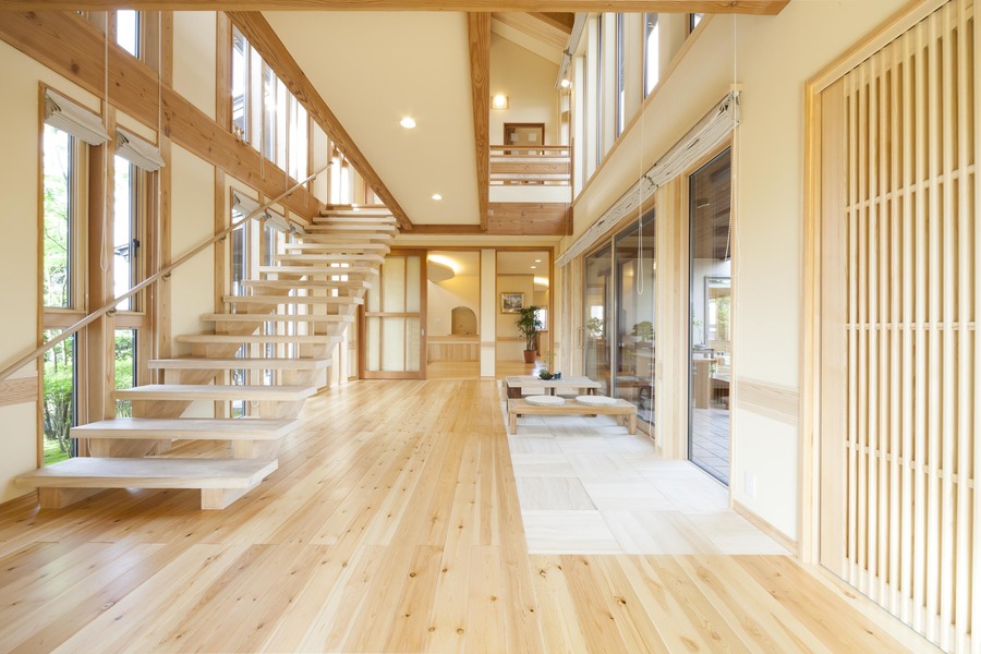 大迫力の吹き抜けと木の存在感に圧倒される空間。琥珀色に深みを増した赤松の艶も楽しめます。