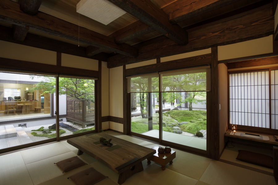 ③重厚な趣をかもす、太鼓梁・井桁天井の和室。古民家調で落ちついた洋室のいやし空間。