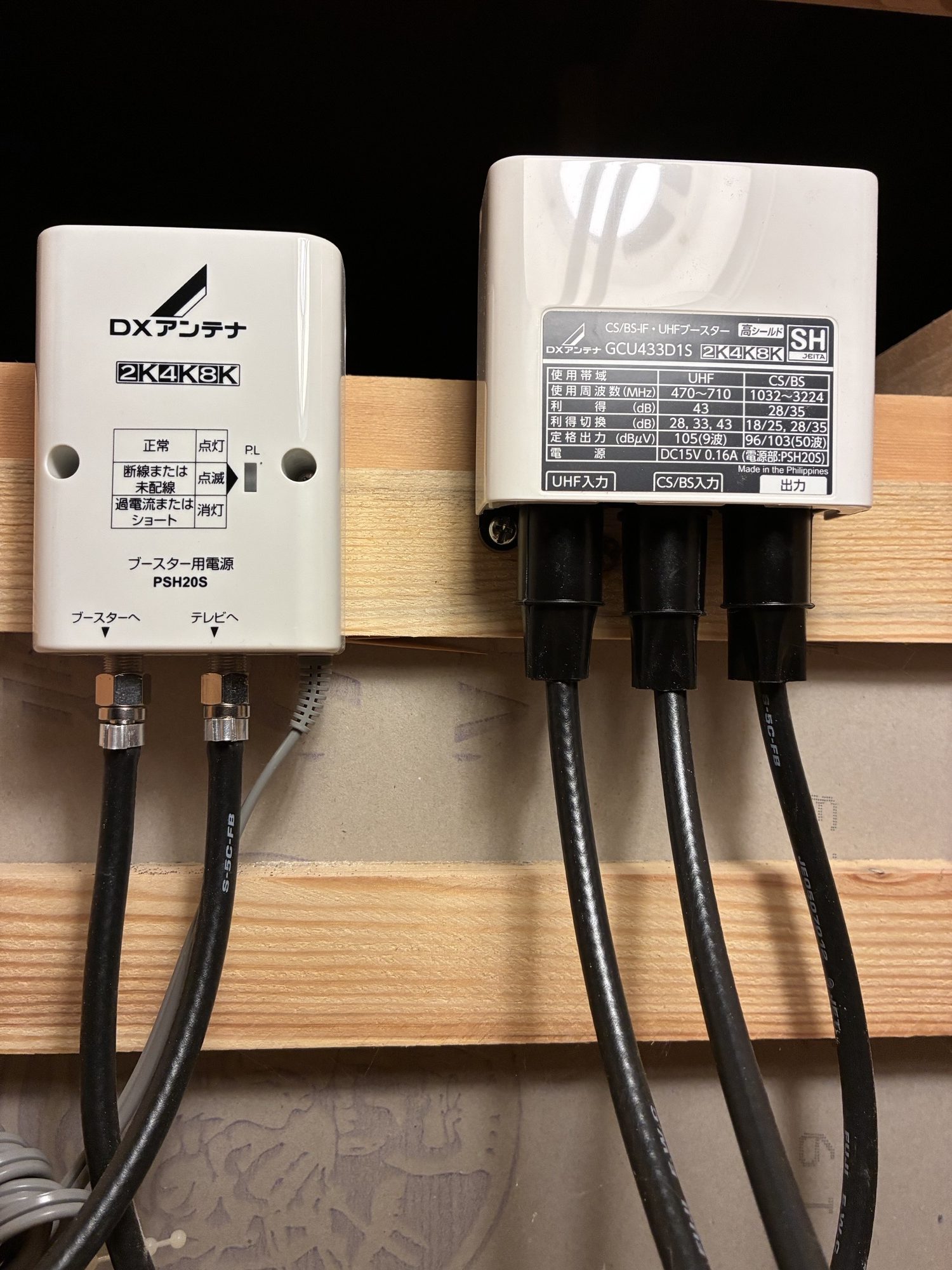 外のアンテナから受信した信号は、長いケーブルや各部屋に分配する事で弱くなります。それを補うための増幅器です。